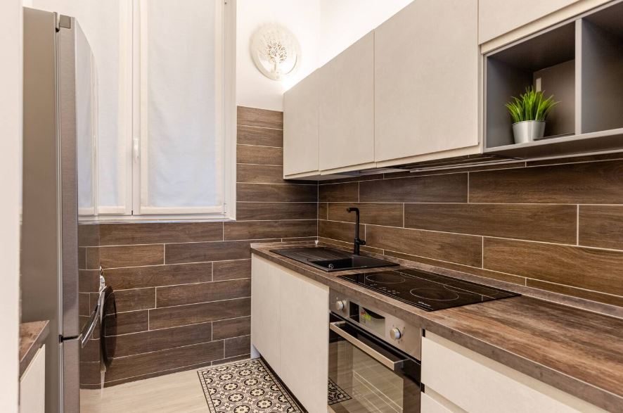 Cucina moderna, con angolo cottura, macchina del caffè, bollitore e stoviglie complete. Arredi neutri in perfetta armonia con lo stile dell’appartamento.